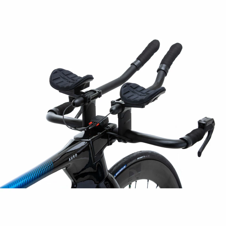 ◌ Le vélo Vitus Auro (Rival eTap AXS) est un vélo de course optimisé pour le contre-la-montre et le triathlon avec un cadre aérodynamique entièrement en carbone équipé d’un groupe électronique sans fil SRAM Rival eTap AXS 2 x 11 vitesses avec freins à disque.